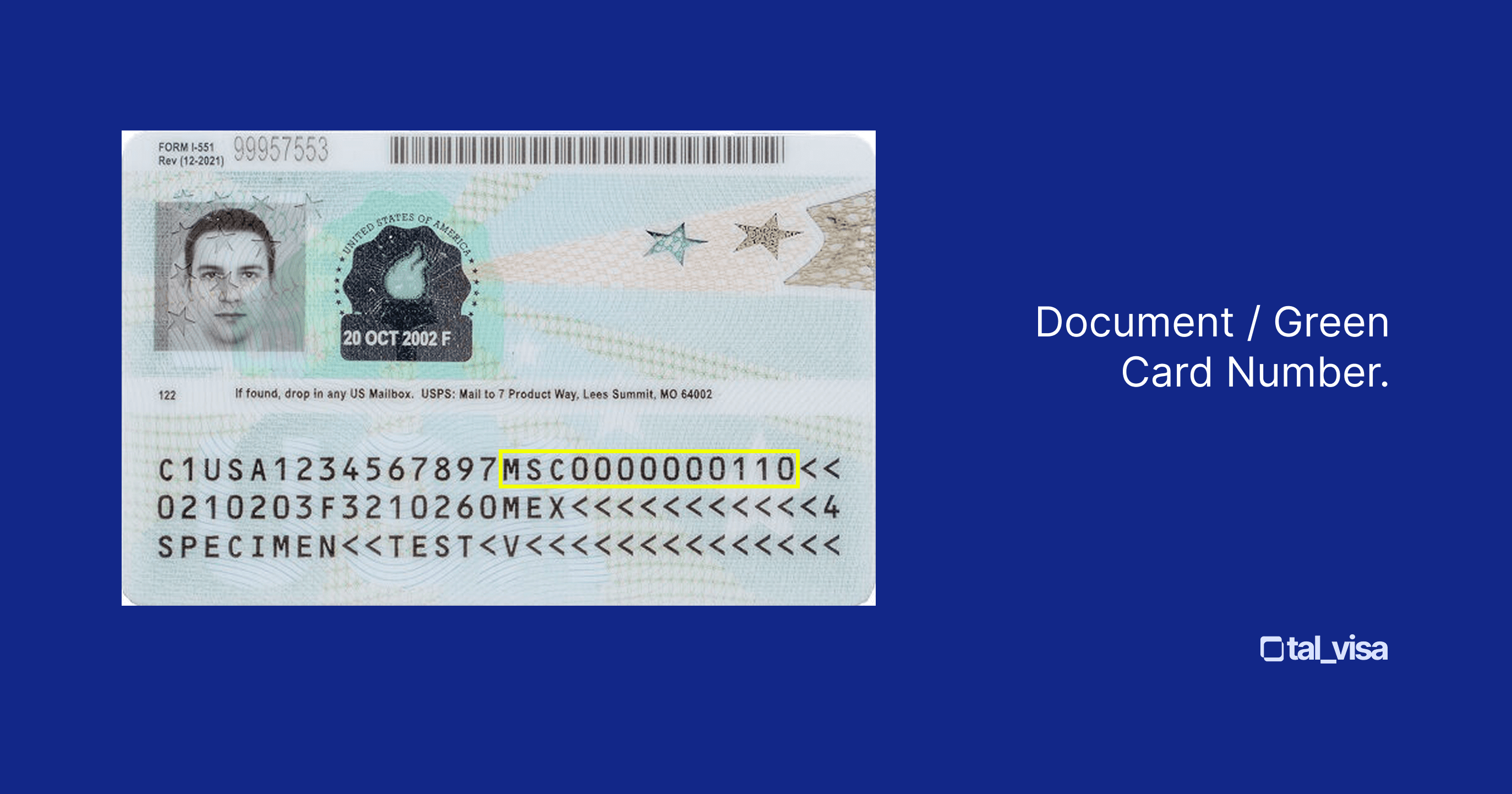 The term "green card number" most commonly refers to the 13-character Document Number printed in the machine-readable zone on the back of the Permanent Resident Card.